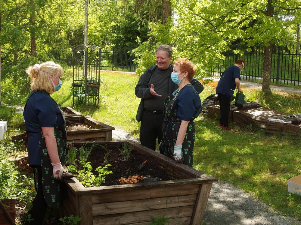Makkarat ja kolmioleivät maistuivat hyvin ulkona. Suolaisen jälkeen jatkettiin kahvittelua keksien, namujen ja jäätelön kera. Välillä halukkaat saivat pelailla erilaisia heittopelejä ja kukkaisryhmämme sai ison määrän kukkia istutettua, kun kevätkylmät nyt näyttävät olevan onneksi jo ohi.