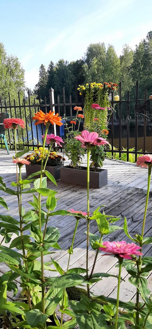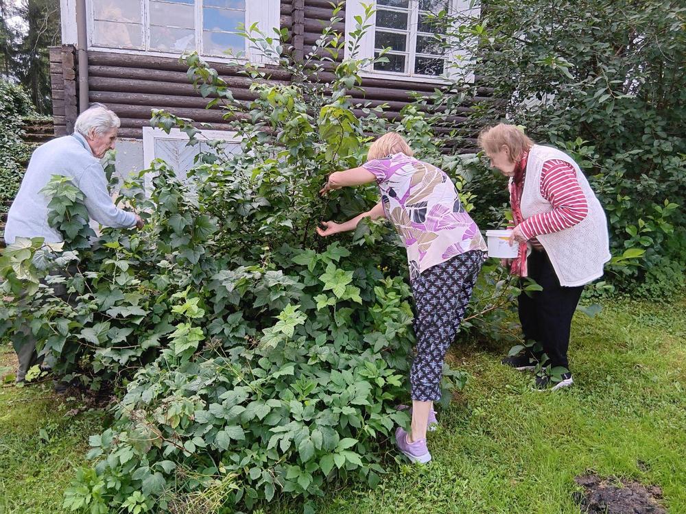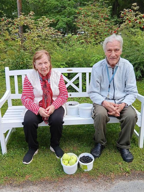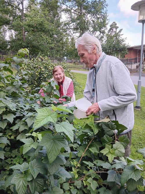 Loppukesän aurinko saa kukkien värit hehkumaan. Keväällä asukkaat idättivät siemeniä ikkunalaudoilla ja alkukesästä hennot taimet siirrettiin istutustalkoilla piharuukkuihin. Nyt kukkaloistoa riittää sekä etupihalla että rantaterassilla. Elokuuhun kuuluu tietysti sadonkorjuu. Piha-alueen pensaista saa vapaasti napsia herkkuja suuhunsa. Herneet on jo syöty, mutta marjoja riittää. Yhteiset poimintahetket ovat mukavia ja saalista kelpaa ihailla.