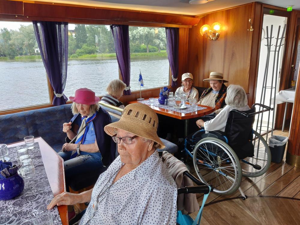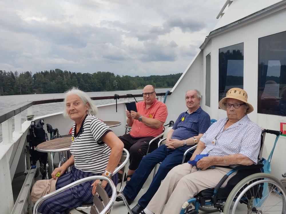 Pidämme joka viikko asukaspalaverin, jossa asukkaat saavat esittää toiveita toiminnasta. Tänään toteutui yksi, ehkä kesän eniten odotettu toive kun risteilypäivä koitti. Mukaan lähti 16 asukasta, henkilökuntaa ja vapaaehtoisia. Sää suosi retkeläisiä. Säätiedotuksessa luvattu sade ja ukkonen pysyivät poissa. Nautimme kakkukahvien lisäksi kauniista maisemista ja hyvästä tunnelmasta. Oli mukavaa päästä katsomaan miltä Ilonpisara näyttää järveltä käsin. Ohittaessamme Ilonpisaran, parvekkeelta raikui tuttujen hoitajien ja asukkaiden iloinen tervehdys!