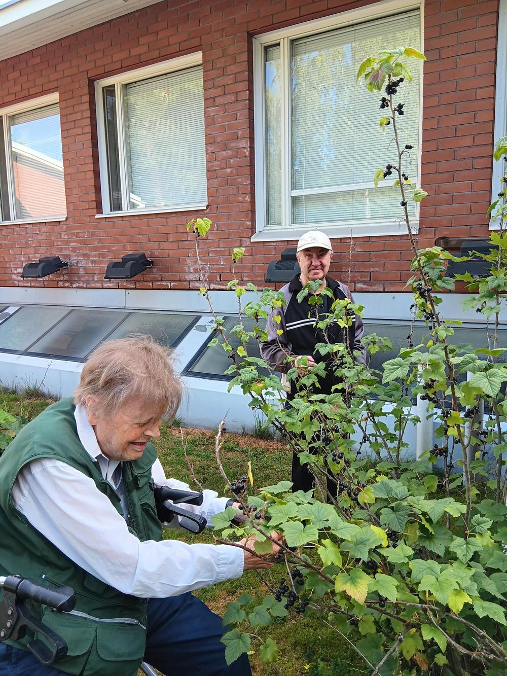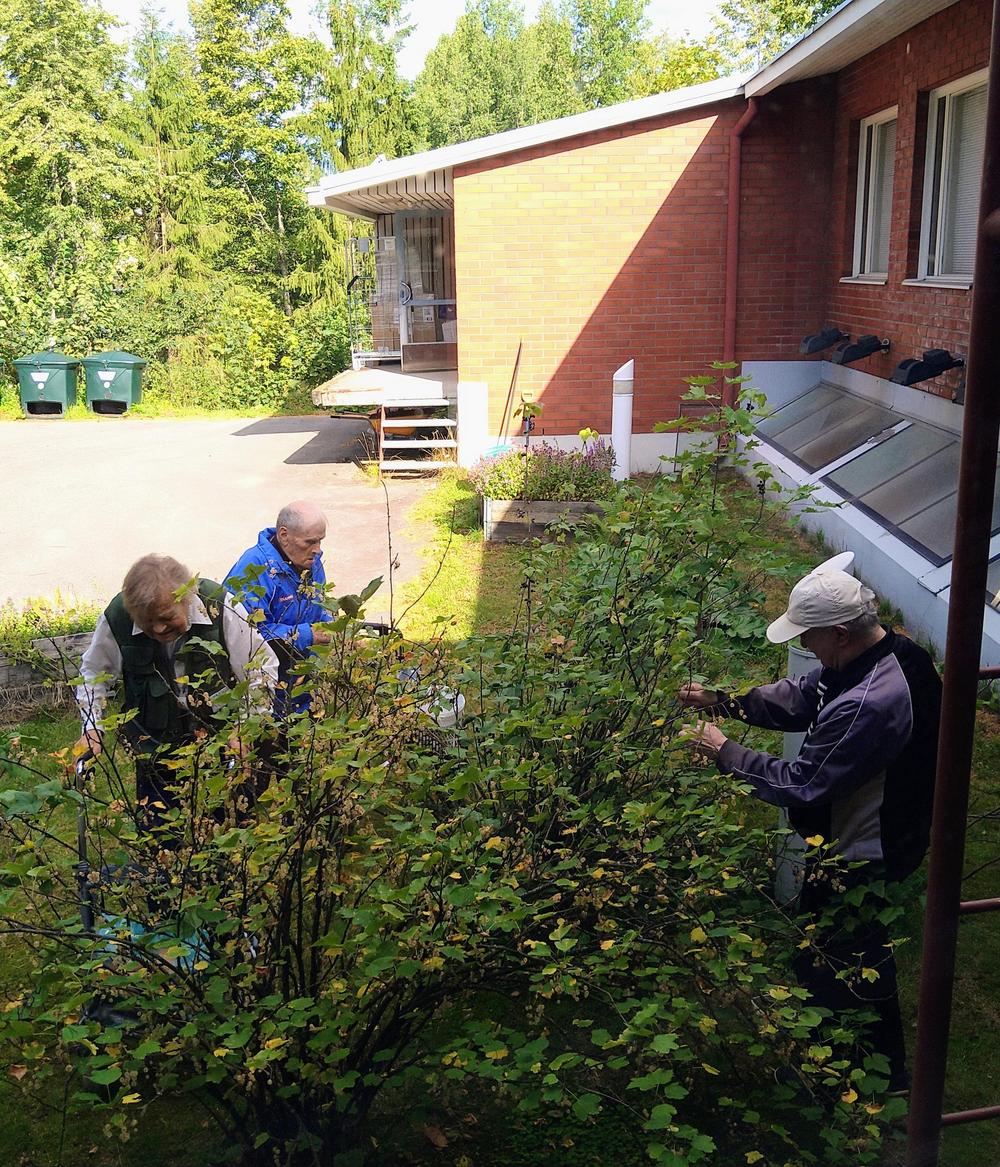 Ilonpisaran tontilla kasvaa monenlaisia herkkuja asukkaiden iloksi. Erilaiset herukat, kirsikka- ja omenapuut tarjoilevat nyt satoa. Kanttarellejakin on löytynyt tontilta kauniina mattona. Tällä viikolla reipas miesporukka kävi keräilemässä marjoja. Alaterassilla herneet ovat sopivasti hyvällä poimintakorkeudella istutuslaatikoissa. Tutut maut kirvoittavat keskustelua ja muistelua omista kotipihoista ja niiden sadosta.